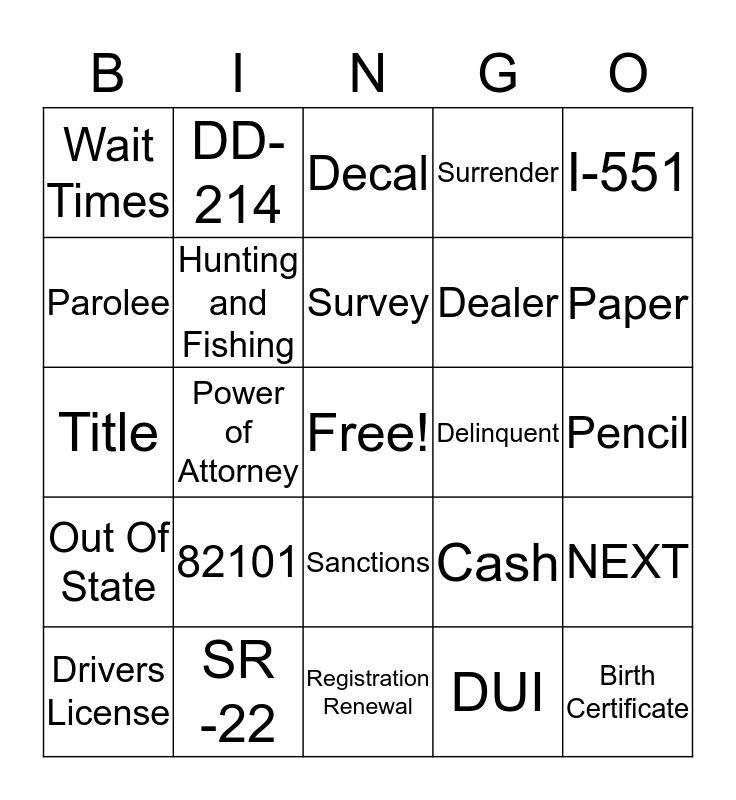 This bingo card has a free space and 29 words: Drivers License, BTR, Power of Attorney, Cashier Check, Wait Times, Decal, Hunting and Fishing, 82101, Delinquent, SR -22, Pencil, Birth Certificate, Registration Renewal, DUI, Paper, Property Tax, Sanctions, Out Of State, I-551, Title, Cash, Financial Responsibility, Dealer, Parolee, Surrender, DD-214, NEXT, Survey and Dress Down.