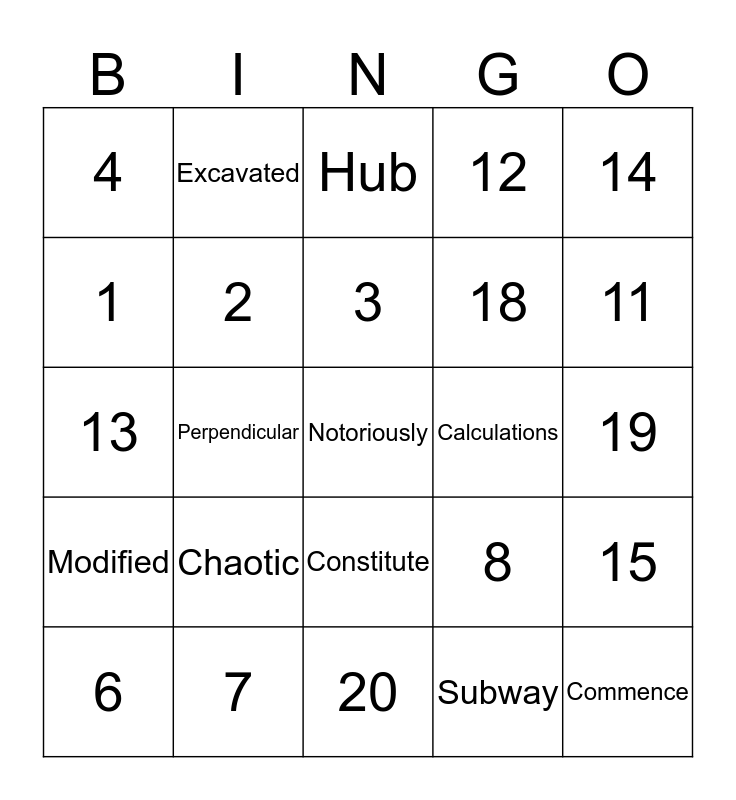 This bingo card has a free space and 24 words: Chaotic, 7, 3, 6, 14, 4, 1, Excavated, Calculations, Constitute, 18, 13, 8, 15, 2, Subway, 19, Hub, 11, Perpendicular, Commence, Modified, 12 and 20.