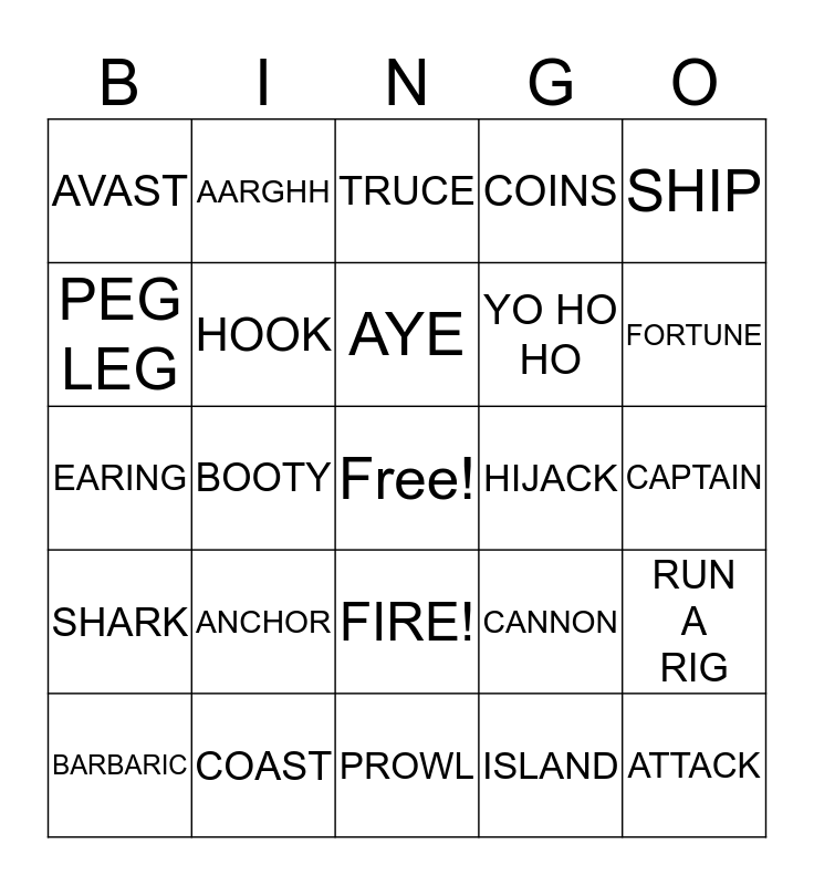 This bingo card has a free space and 66 words: AHOY, LOOT, JOLLY ROGER, RUN A RIG, SCUTTLE, PLANK, AARGHH, ME HEARTIE, AYE, BLOW ME DOWN!, FIRE!, GROG, CAPTAIN, SHIP, SAIL, PEG LEG, BOOTY, AVAST, TREASURE CHEST, YO HO HO, ANCHOR, SHARK, COINS, CONQUER, DANGER, PARROT, ADVENTURE, ASSAULT, ATTACK, BANDANA, BARBARIC, WEAPONS, COMPASS, CAPTURE, CANNON, COAST, ESCAPE, EARING, ISLAND, JEWELS, HOOK, HORIZON, HIJACK, ILLEGAL, ISLAND, FLEET, FORTUNE, EYEPATCH, OCEAN, OVERBOARD, GUN, HEIST, TRADE, TREACHERY, VILLAIN, SWORD, THIEF, SHORE, TRUCE, PROWL, RAID, RAT, KIDNAP, SAILOR, SCURVY and SABOTAGE.