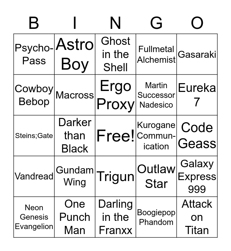 This bingo card has a free space and 26 words: Trigun, Boogiepop Phandom, Ergo Proxy, One Punch Man, Gasaraki, Psycho-Pass, Cowboy Bebop, Astro Boy, Code Geass, Outlaw Star, Martin Successor Nadesico, Steins;Gate, Galaxy Express 999, Neon Genesis Evangelion, Darker than Black, Serial Experiment Lain, Fullmetal Alchemist, Vandread, Ghost in the Shell, Attack on Titan, Eureka 7, Darling in the Franxx, Kurogane Commun-ication, Gundam Wing, Macross and Dragonball Z.
