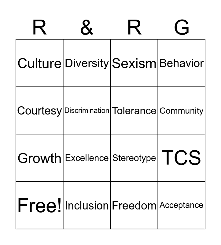 This bingo card has 23 words: Acceptance, Bias, Community, Compassion, Courtesy, Culture, Discrimination, Diversity, Free!, Environment, Excellence, Growth, Harmony, Identity, Inclusion, Racism, Sexism, Stereotype, Tolerance, TCS, Behavior, Freedom and Values.