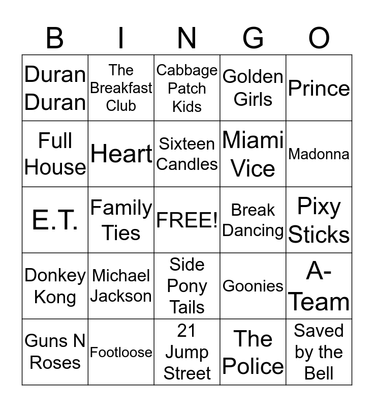 This bingo card has a free space and 24 words: Michael Jackson, Footloose, Sixteen Candles, Guns N Roses, Prince, Duran Duran, Full House, The Breakfast Club, Break Dancing, Side Pony Tails, Miami Vice, E.T., Goonies, A-Team, Heart, The Police, Pixy Sticks, Cabbage Patch Kids, Madonna, Family Ties, Saved by the Bell, Donkey Kong, Golden Girls and 21 Jump Street.