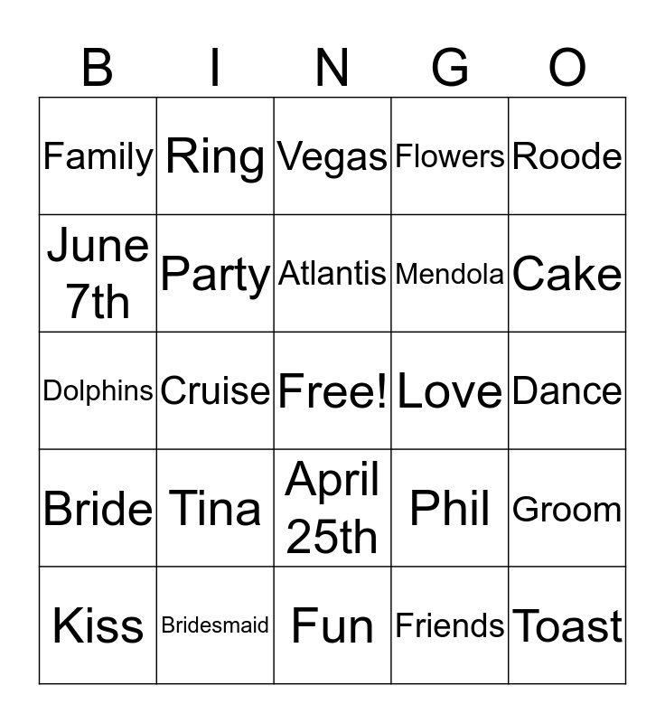 This bingo card has a free space and 24 words: Tina, Bridesmaid, Atlantis, Kiss, Roode, Family, June 7th, Ring, Love, April 25th, Mendola, Dolphins, Phil, Groom, Party, Friends, Dance, Vegas, Cake, Cruise, Toast, Bride, Flowers and Fun.