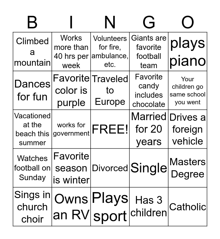 This bingo card has a free space and 24 words: Favorite season is winter, Owns an RV, Traveled to Europe, Sings in church choir, plays piano, Climbed a mountain, Dances for fun, Works more than 40 hrs per week, Married for 20 years, Divorced, Favorite candy includes chocolate, Vacationed at the beach this summer, Single, Masters Degree, Favorite color is purple, Has 3 children, Drives a foreign vehicle, Volunteers for fire, ambulance, etc., Your children go same school you went, works for government, Catholic, Watches football on Sunday, Giants are favorite football team and Plays sport.