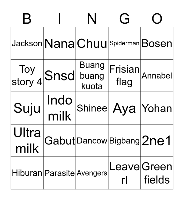 This bingo card has a free space and 24 words: Hiburan, Gabut, Buang buang kuota, Leave rl, Bosen, Jackson, Nana, Chuu, Aya, Yohan, Suju, Snsd, Bigbang, 2ne1, Toy story 4, Parasite, Avengers, Spiderman, Annabel, Ultra milk, Indo milk, Dancow, Frisian flag and Green fields.