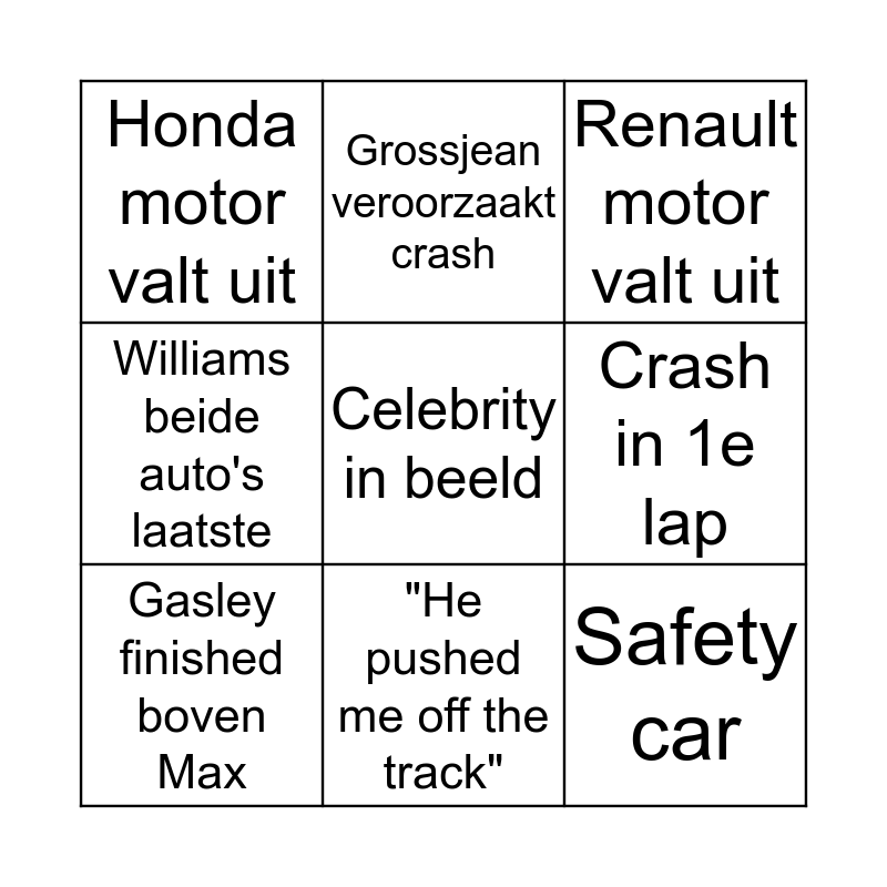 This bingo card has 21 words: Kvyat veroorzaakt crash, Straks gaan we racen, Grossjean veroorzaakt crash, Hammilton klaagt over de auto, Olaf maakt een fout, Gasley finished boven Max, Honda motor valt uit, Renault motor valt uit, Mercedes 1,2, "He pushed me off the track", Safety car, Williams beide auto's laatste, "Box-Box-Box", Lekke band, Crash in 1e lap, Stewards geven penalty, Team order; switch, Jack praat door boordradio heen, Celebrity in beeld, Olaf komt met een circuit geitje and Regie mist live actie (inhaalmoment).