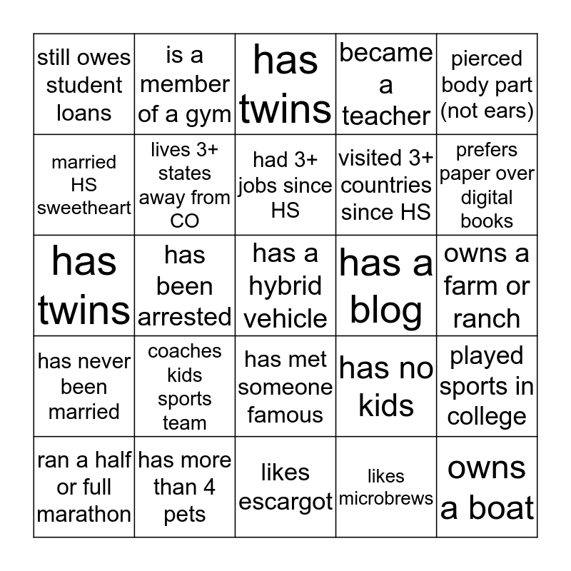 This bingo card has a free space and 44 words: loves to ccok, owns a boat, seen all the marvel movies, ran a half or full marathon, has an electric car, likes microbrews, has twins, has a podcast, pierced body part (not ears), has more than 4 pets, became a teacher, has a blog, has met someone famous, coaches kids sports team, has been on a cruise, likes escargot, almost didn't graduate, has twins, still has natural hair color, prefers paper over digital books, is a member of a gym, has a teenager, did not go to college, still owes student loans, mas a Master's Degree, owns a farm or ranch, speaks more than 1 language, has never left Fort Morgan, has no kids, has never been married, been married 15+ years, played sports in college, wears glasses, has 3+ tattoos, has been arrested, owns their own business, has more 4 or more kids, owns their own home, had 3+ jobs since HS, married HS sweetheart, visited 3+ countries since HS, works in the medical field, lives 3+ states away from CO and married more than once.