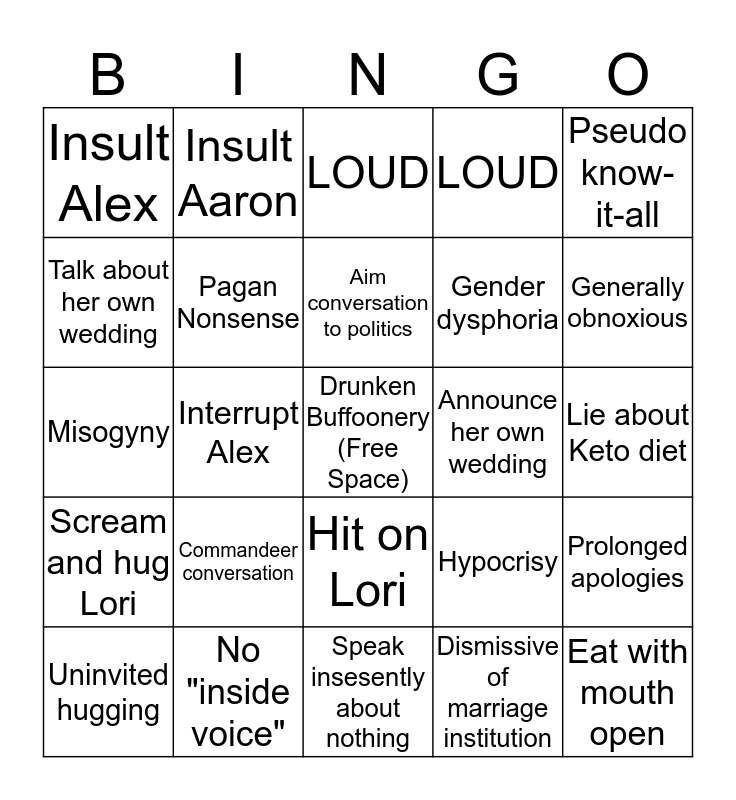 This bingo card has a free space and 24 words: Commandeer conversation, No "inside voice", Aim conversation to politics, Uninvited hugging, Pseudo know-it-all, Insult Alex, Talk about her own wedding, Insult Aaron, Announce her own wedding, Hit on Lori, Gender dysphoria, Misogyny, Hypocrisy, Prolonged apologies, Pagan Nonsense, Dismissive of marriage institution, Lie about Keto diet, LOUD, Generally obnoxious, Interrupt Alex, Eat with mouth open, Scream and hug Lori, LOUD and Speak insesently about nothing.