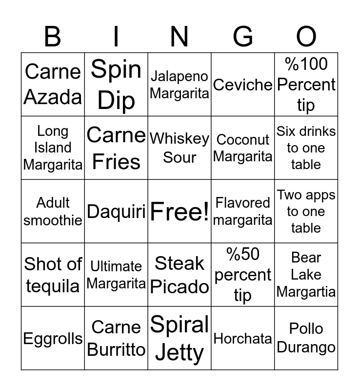 This bingo card has a free space and 24 words: Ultimate Margarita, Carne Burritto, Whiskey Sour, Eggrolls, %100 Percent tip, Carne Azada, Long Island Margarita, Spin Dip, Flavored margarita, Steak Picado, Coconut Margarita, Adult smoothie, %50 percent tip, Bear Lake Margartia, Carne Fries, Horchata, Two apps to one table, Jalapeno Margarita, Six drinks to one table, Daquiri, Pollo Durango, Shot of tequila, Ceviche and Spiral Jetty.