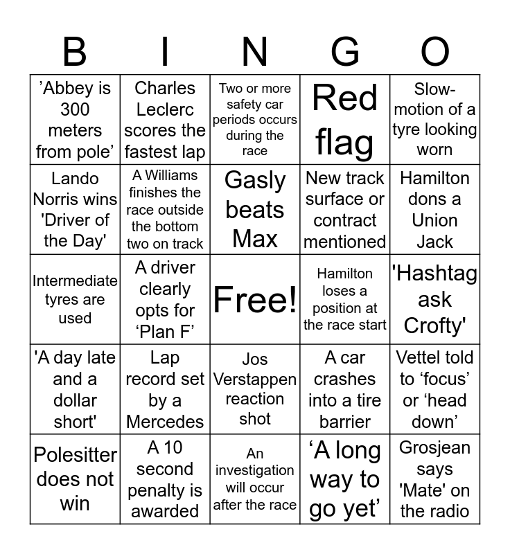 This bingo card has a free space and 24 words: Lap record set by a Mercedes, A 10 second penalty is awarded, Gasly beats Max, Polesitter does not win, Slow-motion of a tyre looking worn, ’Abbey is 300 meters from pole’, Lando Norris wins 'Driver of the Day', Charles Leclerc scores the fastest lap, Hamilton loses a position at the race start, Jos Verstappen reaction shot, New track surface or contract mentioned, Intermediate tyres are used, A car crashes into a tire barrier, Vettel told to ‘focus’ or ‘head down’, A Williams finishes the race outside the bottom two on track, ‘A long way to go yet’, 'Hashtag ask Crofty', Two or more safety car periods occurs during the race, Hamilton dons a Union Jack, A driver clearly opts for ‘Plan F’, Grosjean says 'Mate' on the radio, 'A day late and a dollar short', Red flag and An investigation will occur after the race.