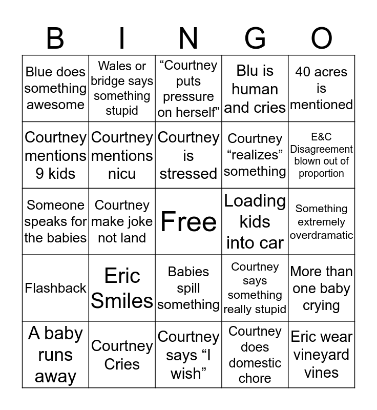 This bingo card has a free space and 24 words: Eric Smiles, Courtney Cries, Courtney is stressed, A baby runs away, 40 acres is mentioned, Blue does something awesome, Courtney mentions 9 kids, Wales or bridge says something stupid, Loading kids into car, Babies spill something, Courtney “realizes” something, Someone speaks for the babies, Courtney says something really stupid, More than one baby crying, Courtney mentions nicu, Courtney does domestic chore, Something extremely overdramatic, “Courtney puts pressure on herself”, E&C Disagreement blown out of proportion, Courtney make joke not land, Eric wear vineyard vines, Flashback, Blu is human and cries and Courtney says “I wish”.