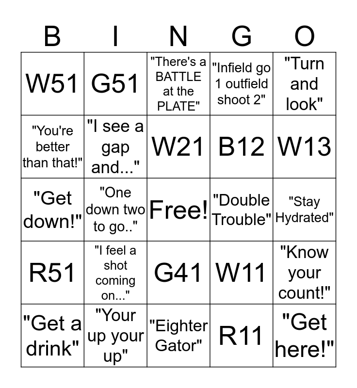 This bingo card has a free space and 24 words: "I feel a shot coming on...", "Your up your up", W21, "Get a drink", "Turn and look", W51, "You're better than that!", G51, "Double Trouble", G41, B12, "Get down!", W11, "Know your count!", "I see a gap and...", R11, "Stay Hydrated", "There's a BATTLE at the PLATE", W13, "One down two to go..", "Get here!", R51, "Infield go 1 outfield shoot 2" and "Eighter Gator".