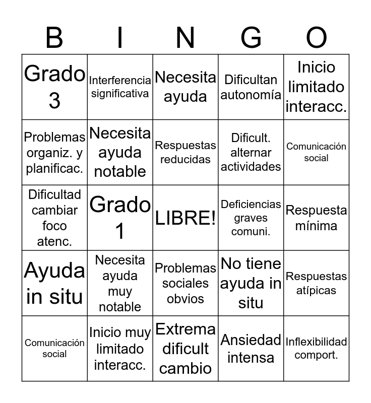 This bingo card has a free space and 29 words: Comunicación social, Comport. restring. repetitivos, Grado 1, Grado 2, Grado 3, Necesita ayuda, Necesita ayuda notable, Necesita ayuda muy notable, Deficiencias graves comuni., Inicio muy limitado interacc., Respuesta mínima, Inflexibilidad comport., Extrema dificult cambio, Ansiedad intensa, Comunicación social, Comunic verbal y no verbal, Problemas sociales obvios, Ayuda in situ, Inicio limitado interacc., Dificultad cambiar foco atenc., No tiene ayuda in situ, Parece que tiene poco interés, Dificult. alternar actividades, Problemas organiz. y planificac., Dificultan autonomía, Interferencia significativa, Respuestas atípicas, Respuestas reducidas and Apertura social.