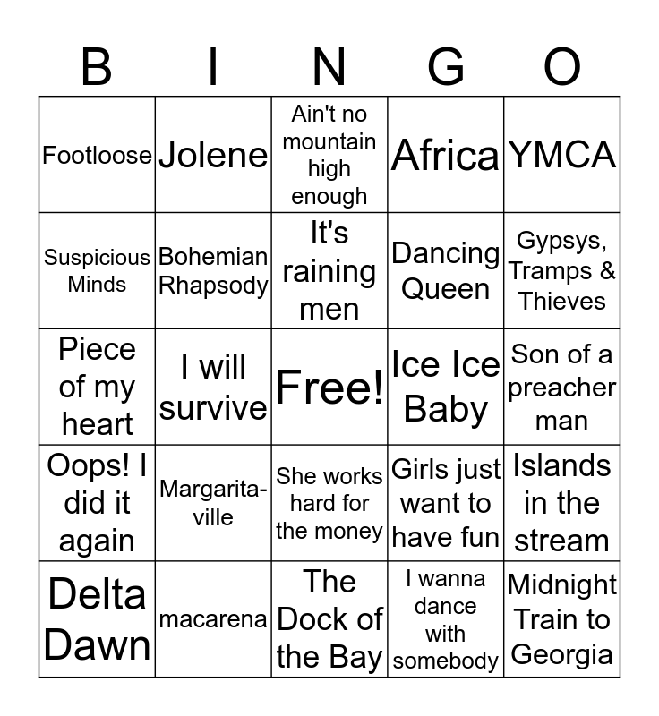 This bingo card has a free space and 49 words: A Natural Woman, Midnight Train to Georgia, Lean on Me, The Dock of the Bay, Margarita-ville, We are the world, Jolene, Boogie Woogie Bugle Boy, Suspicious Minds, Sweet Caroline, Bohemian Rhapsody, Africa, Islands in the stream, Girls just want to have fun, Pink Cadillac, Jump, It's raining men, Ice Ice Baby, Lady Marmalade, YMCA, I will survive, I wanna dance with somebody, Footloose, Dancing Queen, Copa-cabana, Gypsys, Tramps & Thieves, Delta Dawn, What's love got to do w/ it, She works hard for the money, Oops! I did it again, Karma Chameleon, Ring my bell, Ring of fire, Livin' la vida loca, macarena, Total eclipse of the heart, Black velvet, Hound dog, Son of a preacher man, Brown eyed girl, Tiny Dancer, Oh, pretty woman, The time of my life, Proud Mary, Piece of my heart, Ain't no mountain high enough, Always on my mind, Crazy and Georgia on my mind.