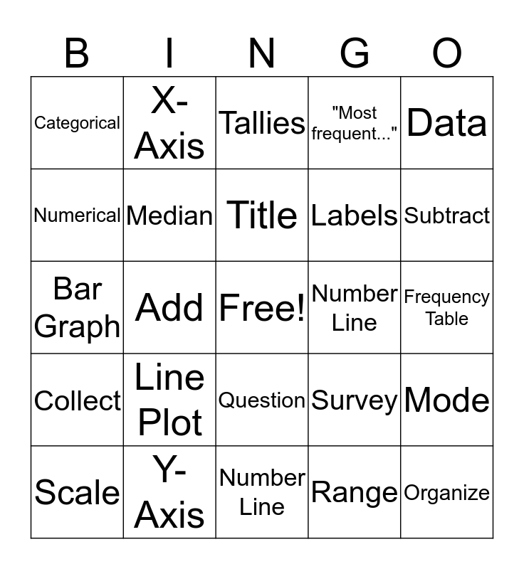 This bingo card has a free space and 24 words: Line Plot, Y-Axis, Title, Scale, Data, Categorical, Numerical, X-Axis, Number Line, Question, Labels, Bar Graph, Survey, Mode, Median, Range, Frequency Table, Tallies, Subtract, Add, Organize, Collect, "Most frequent..." and Number Line.