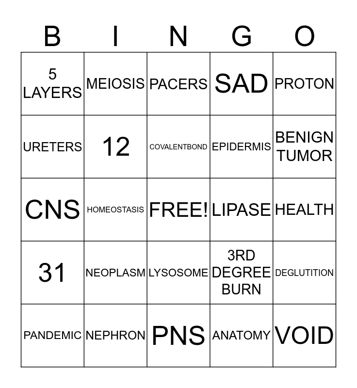 This bingo card has a free space and 24 words: NEOPLASM, NEPHRON, COVALENTBOND, PANDEMIC, PROTON, 5 LAYERS, URETERS, MEIOSIS, LIPASE, LYSOSOME, EPIDERMIS, CNS, 3RD DEGREE BURN, DEGLUTITION, 12, ANATOMY, HEALTH, PACERS, BENIGN TUMOR, HOMEOSTASIS, VOID, 31, SAD and PNS.