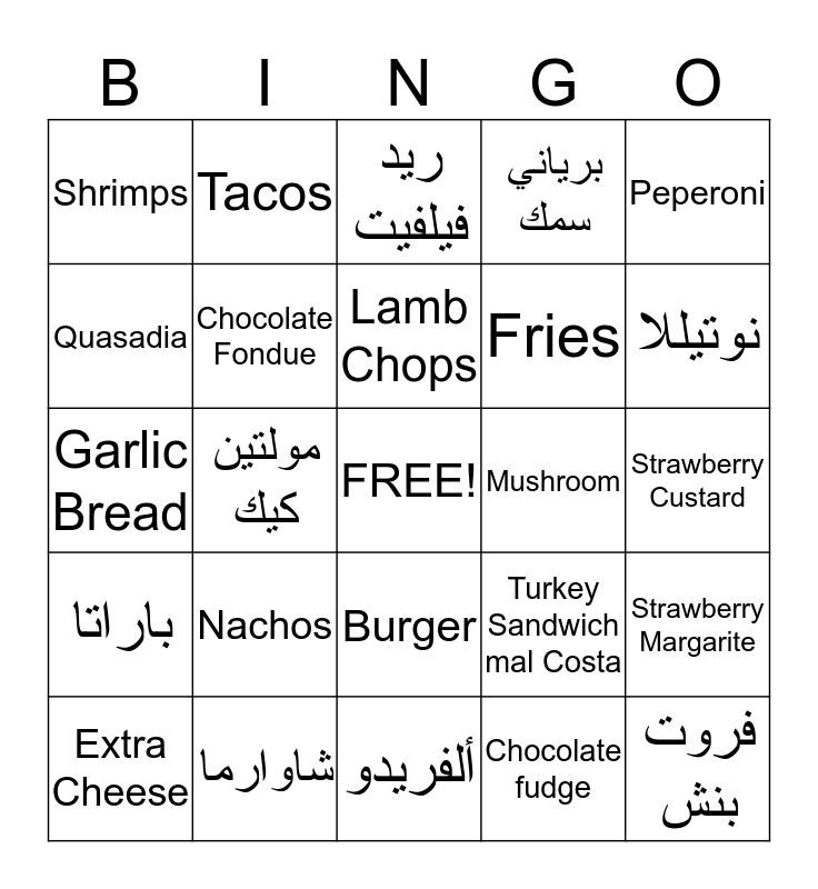 This bingo card has a free space and 24 words: Nachos, شاوارما, Lamb Chops, Extra Cheese, Peperoni, Shrimps, Quasadia, Tacos, Mushroom, Burger, Fries, Garlic Bread, Turkey Sandwich mal Costa, Strawberry Margarite, Chocolate Fondue, Chocolate fudge, Strawberry Custard, ريد فيلفيت, نوتيللا, مولتين كيك, فروت بنش, باراتا, برياني سمك and ألفريدو.