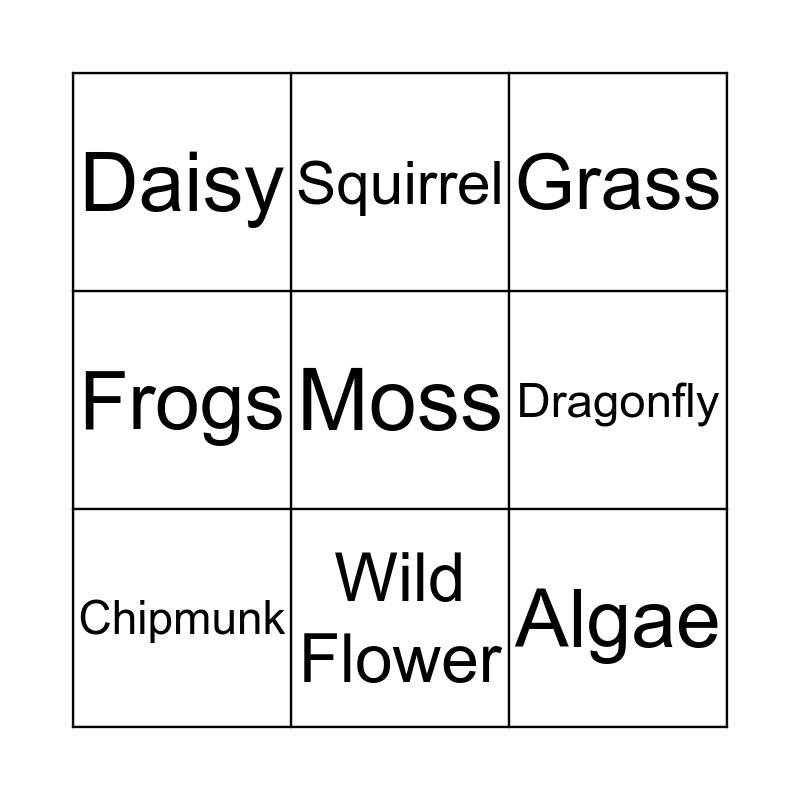 This bingo card has 16 words: Campers, Pine Tree, Grass, Daisy, Algae, Squirrel, Duck, Hawk, Moss, Dragonfly, Butterfly, Frogs, Fish, Wild Flower, Chipmunk and Song Bird.