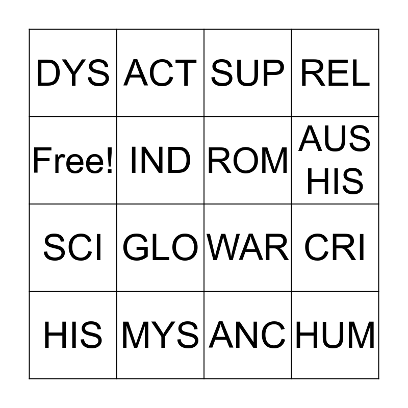 This bingo card has 16 words: MYS, CRI, SUP, DYS, SCI, ACT, WAR, ANC, Free!, IND, HIS, REL, GLO, AUS HIS, ROM and HUM.