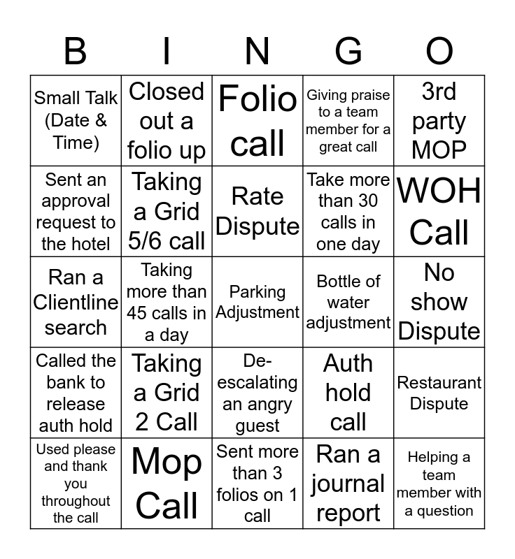 This bingo card has 25 words: Taking a Grid 2 Call, Sent more than 3 folios on 1 call, Rate Dispute, Used please and thank you throughout the call, 3rd party MOP, Small Talk (Date & Time), Sent an approval request to the hotel, Closed out a folio up, Bottle of water adjustment, De-escalating an angry guest, Take more than 30 calls in one day, Ran a Clientline search, Auth hold call, Restaurant Dispute, Taking a Grid 5/6 call, Helping a team member with a question, No show Dispute, Folio call, WOH Call, Taking more than 45 calls in a day, Parking Adjustment, Mop Call, Called the bank to release auth hold, Giving praise to a team member for a great call and Ran a journal report.