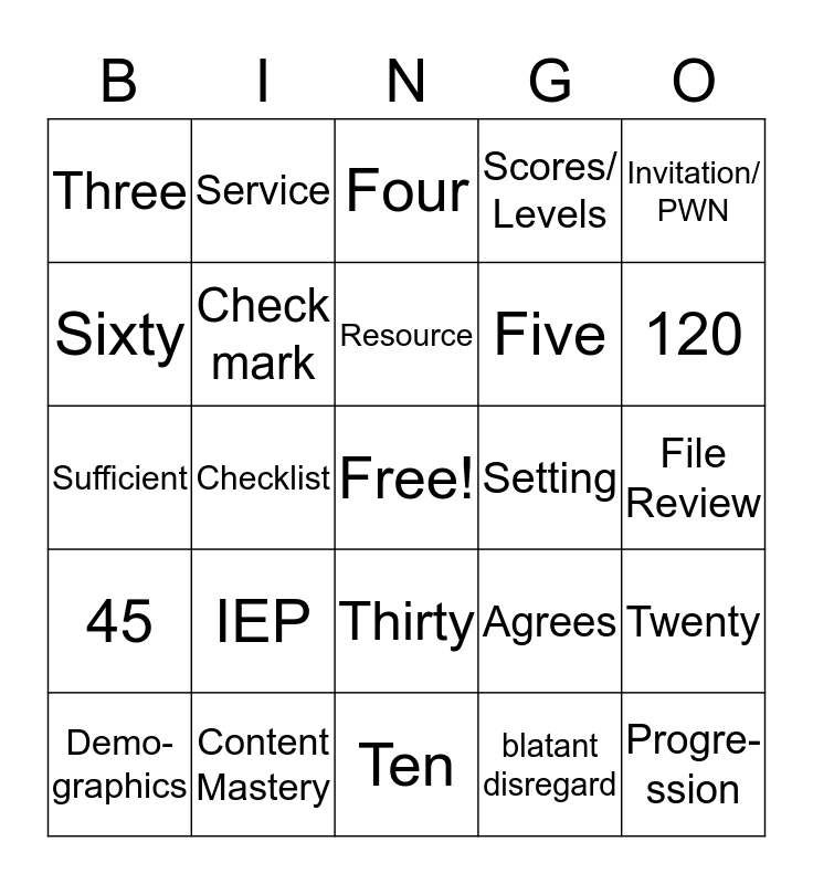 This bingo card has a free space and 24 words: IEP, Content Mastery, Resource, Demo-graphics, Invitation/ PWN, Three, Sixty, Service, Setting, Thirty, Five, Sufficient, Agrees, Twenty, Check mark, blatant disregard, File Review, Four, 120, Checklist, Progre-ssion, 45, Scores/ Levels and Ten.
