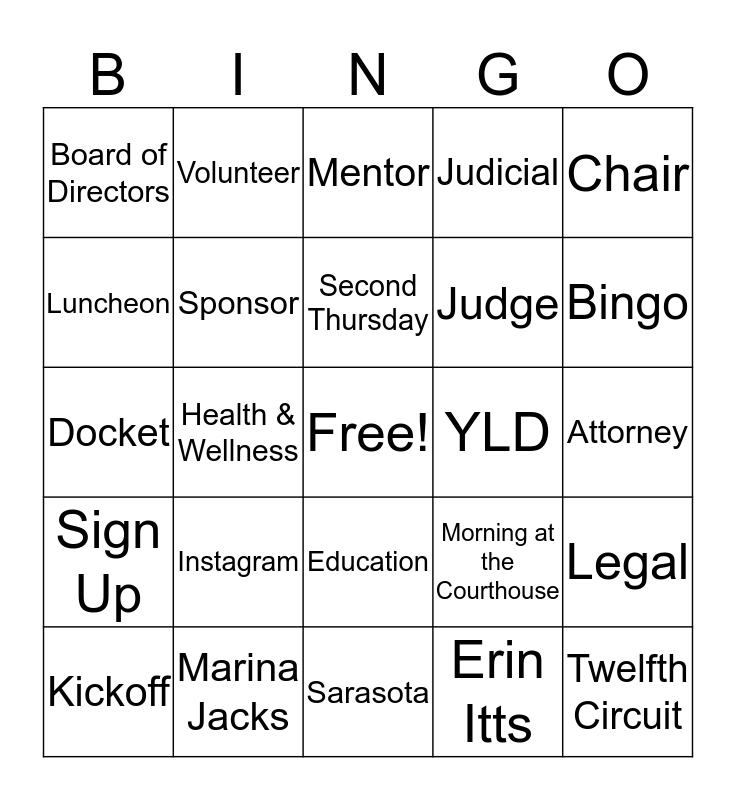 This bingo card has a free space and 33 words: Law Week, Holly Lipps, Health & Wellness, Bank of Tampa, Sign Up, Sponsor, Chair, Kickoff, Volunteer, SCBA, Second Thursday, Mentor, Mock Trial, Holiday Party, YLD, Bingo, Marina Jacks, Docket, Instagram, Morning at the Courthouse, Education, Committee, Board of Directors, Attorney, Sarasota, Twelfth Circuit, Judicial, Judge, Luncheon, Legal, Brian Goodrich, Erin Itts and Technology.