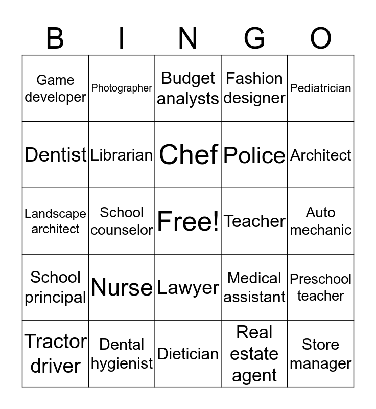 This bingo card has a free space and 24 words: Tractor driver, Nurse, Chef, Real estate agent, Pediatrician, Game developer, Photographer, Budget analysts, Teacher, Auto mechanic, Landscape architect, Librarian, Medical assistant, Preschool teacher, Dentist, Dental hygienist, Dietician, Fashion designer, Architect, School principal, School counselor, Lawyer, Police and Store manager.