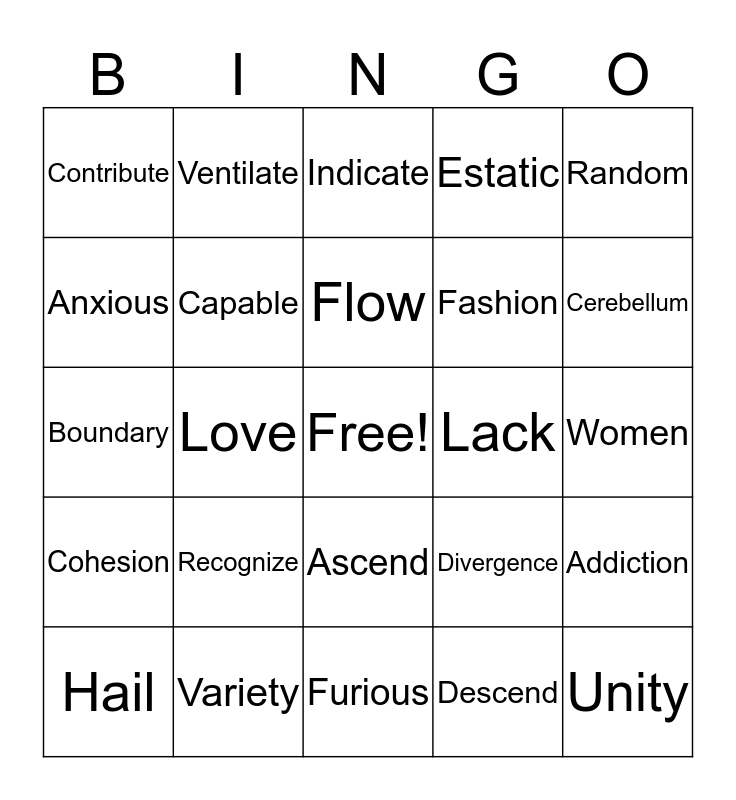 This bingo card has a free space and 29 words: Hail, Peculiar, Love, Plentiful, Contribute, Indicate, Capable, Recognize, Lack, Variety, Women, Unity, Furious, Descend, Cerebellum, Power, Ascend, Cohesion, Random, Boundary, Divergence, Diversity, Fashion, Anxious, Estatic, Ventilate, Addiction, Flow and Division.