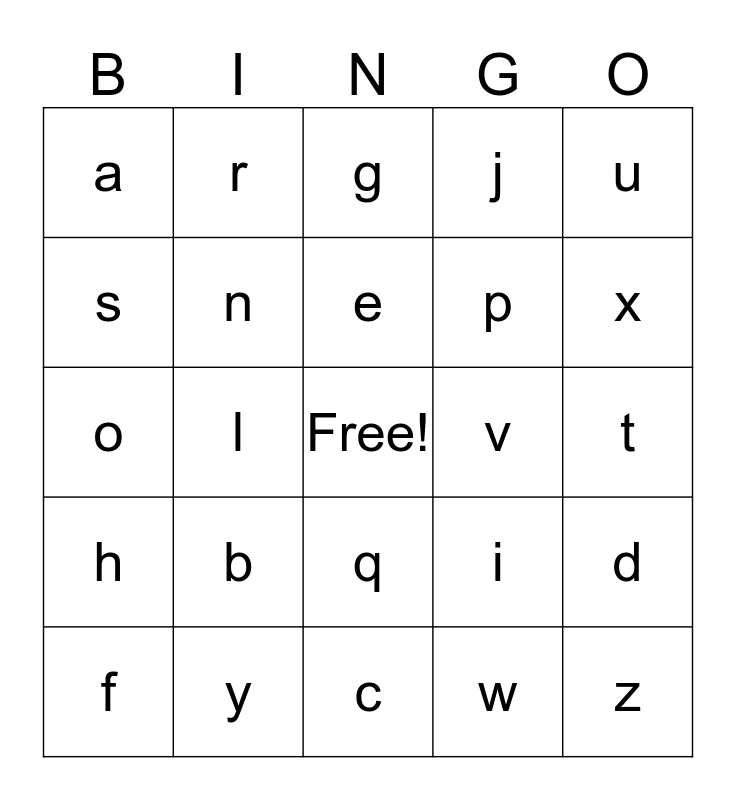 This bingo card has a free space and 26 words: q, w, e, y, u, a, s, r, t, i, p, o, d, f, l, k, j, h, g, z, x, c, v, b, n and m.