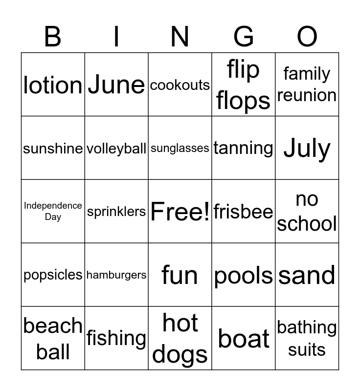 This bingo card has a free space and 45 words: August, bathing suits, beach, beach ball, blue skies, boat, cookouts, cruise, family reunion, fishing, flip flops, frisbee, fun, hamburgers, heat, hot dogs, ice cream, Independence Day, jet ski, July, June, lake, lemonade, lotion, mosquitoes, no school, outdoors, parks, pools, popsicles, road trips, sand, sand castles, shade, snow cones, sprinklers, summer, summer camp, summer days, sunglasses, sunshine, tanning, vacation, volleyball and water balloons.