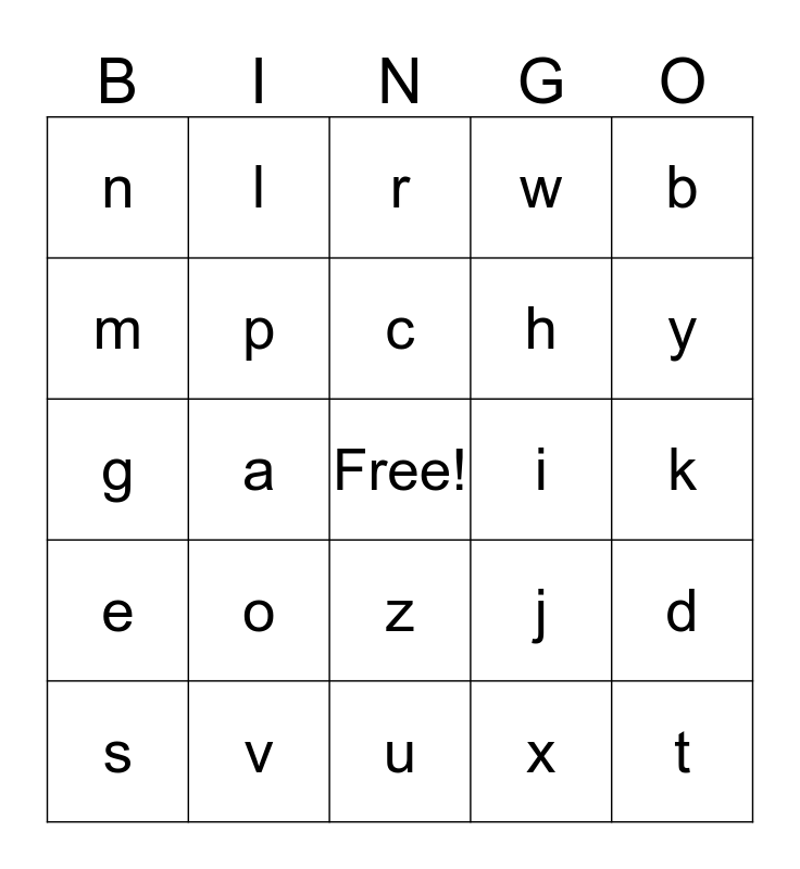 This bingo card has a free space and 26 words: z, x, c, v, b, n, m, l, k, j, h, g, d, s, a, q, w, e, r, t, y, u, i, o, p and f.