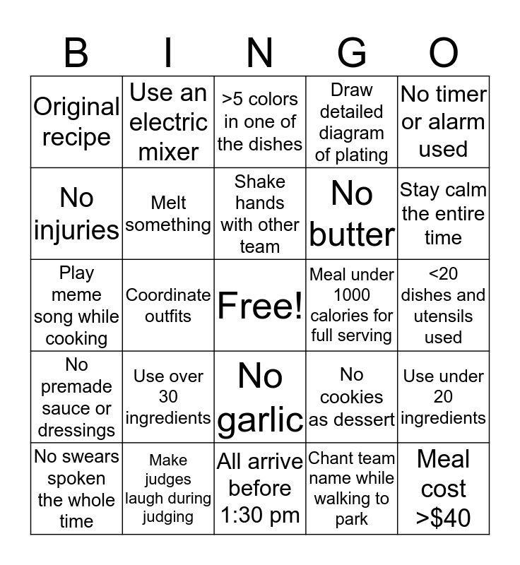 This bingo card has a free space and 24 words: Use over 30 ingredients, Make judges laugh during judging, Shake hands with other team, No swears spoken the whole time, No timer or alarm used, Original recipe, No injuries, Use an electric mixer, Meal under 1000 calories for full serving, No garlic, No butter, Play meme song while cooking, No cookies as dessert, Use under 20 ingredients, Melt something, Chant team name while walking to park, <20 dishes and utensils used, >5 colors in one of the dishes, Stay calm the entire time, Coordinate outfits, Meal cost >$40, No premade sauce or dressings, Draw detailed diagram of plating and All arrive before 1:30 pm.