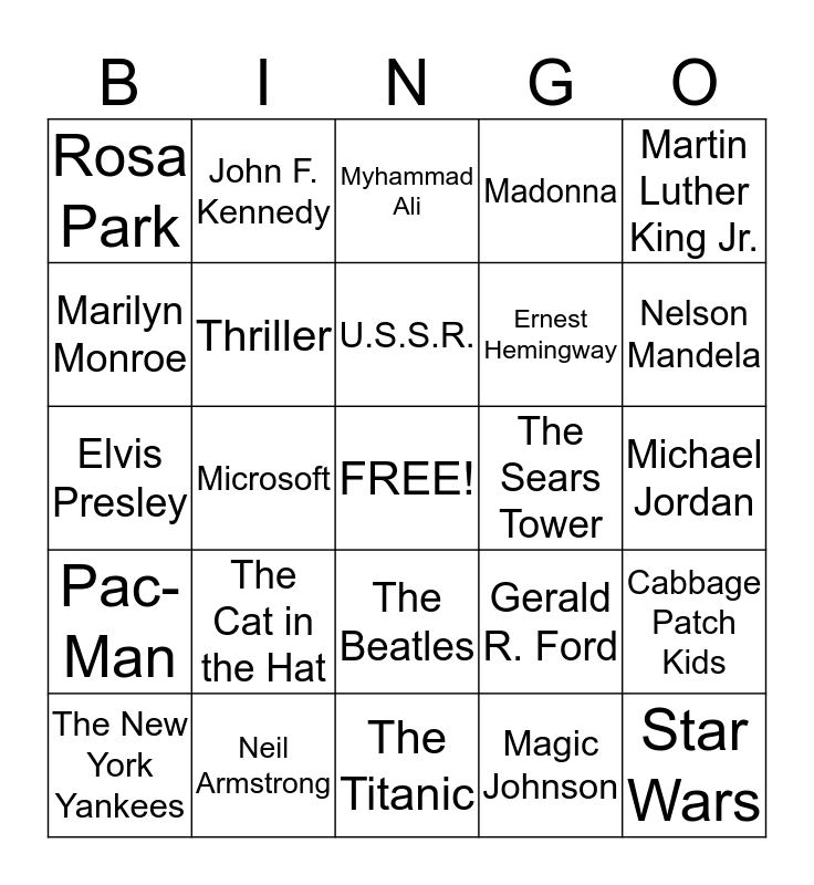 This bingo card has a free space and 24 words: The Cat in the Hat, Neil Armstrong, U.S.S.R., The New York Yankees, Martin Luther King Jr., Rosa Park, Marilyn Monroe, John F. Kennedy, The Sears Tower, The Beatles, Ernest Hemingway, Elvis Presley, Gerald R. Ford, Cabbage Patch Kids, Thriller, Magic Johnson, Michael Jordan, Myhammad Ali, Nelson Mandela, Microsoft, Star Wars, Pac-Man, Madonna and The Titanic.