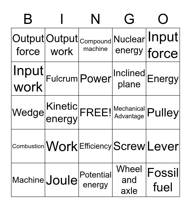 This bingo card has a free space and 24 words: Work, Joule, Power, Machine, Input force, Output force, Input work, Output work, Mechanical Advantage, Efficiency, Inclined plane, Wedge, Screw, Lever, Fulcrum, Wheel and axle, Pulley, Compound machine, Energy, Kinetic energy, Fossil fuel, Combustion, Nuclear energy and Potential energy.