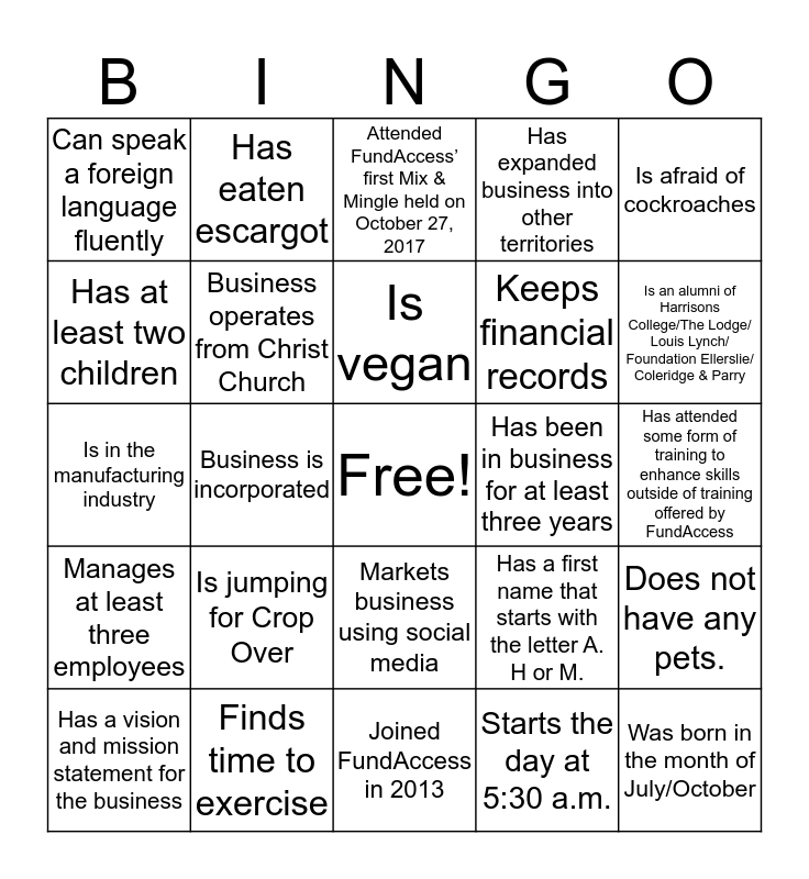 This bingo card has a free space and 24 words: Is jumping for Crop Over, Finds time to exercise, Is vegan, Has a vision and mission statement for the business, Is afraid of cockroaches, Can speak a foreign language fluently, Has at least two children, Has eaten escargot, Has been in business for at least three years, Markets business using social media, Keeps financial records, Is in the manufacturing industry, Has a first name that starts with the letter A. H or M., Does not have any pets., Business operates from Christ Church, Starts the day at 5:30 a.m., Has attended some form of training to enhance skills outside of training offered by FundAccess, Attended FundAccess’ first Mix & Mingle held on October 27, 2017, Is an alumni of Harrisons College/The Lodge/ Louis Lynch/ Foundation Ellerslie/ Coleridge & Parry, Business is incorporated, Was born in the month of July/October, Manages at least three employees, Has expanded business into other territories and Joined FundAccess in 2013.