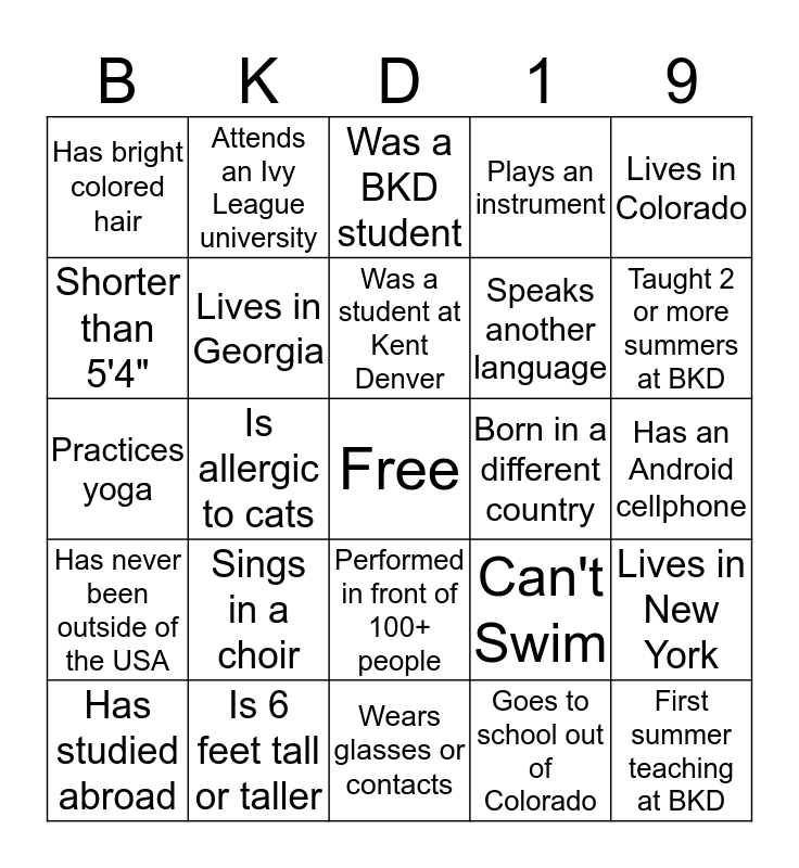 This bingo card has a free space and 24 words: Sings in a choir, Is 6 feet tall or taller, Was a student at Kent Denver, Has studied abroad, Lives in Colorado, Has bright colored hair, Shorter than 5'4", Attends an Ivy League university, Born in a different country, Performed in front of 100+ people, Speaks another language, Practices yoga, Can't Swim, Lives in New York, Lives in Georgia, Goes to school out of Colorado, Has an Android cellphone, Was a BKD student, Taught 2 or more summers at BKD, Is allergic to cats, First summer teaching at BKD, Has never been outside of the USA, Plays an instrument and Wears glasses or contacts.