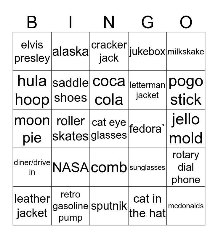 This bingo card has 35 words: bel air car, record, poodle skirt, saddle shoes, comb, jukebox, hula hoop, rc cola, coca cola, coca cola & peanuts, moon pie, milkskake, barbie doll, soda fountain, elvis presley, fedora`, cat in the hat, roller skates, diner/drive in, cat eye glasses, sunglasses, leather jacket, rotary dial phone, retro gasoline pump, cracker jack, pogo stick, mcdonalds, coonskin cap, letterman jacket, jello mold, peanuts comic strip, sputnik, NASA, alaska and hawaii.