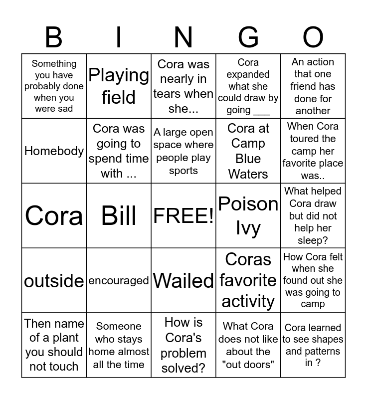 This bingo card has a free space and 24 words: encouraged, Someone who stays home almost all the time, A large open space where people play sports, Then name of a plant you should not touch, An action that one friend has done for another, Something you have probably done when you were sad, Homebody, Playing field, Poison Ivy, Wailed, Cora at Camp Blue Waters, Cora, Coras favorite activity, How Cora felt when she found out she was going to camp, Cora was going to spend time with ..., What Cora does not like about the "out doors", What helped Cora draw but did not help her sleep?, Cora was nearly in tears when she..., When Cora toured the camp her favorite place was.., Bill, Cora learned to see shapes and patterns in ?, outside, Cora expanded what she could draw by going ___ and How is Cora's problem solved?.