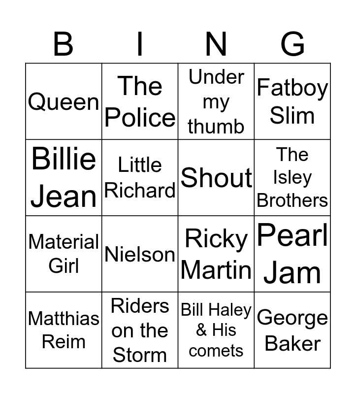 This bingo card has 20 words: Pearl Jam, Scooter, Under my thumb, KC & The Sunshine Band, Matthias Reim, Billie Jean, Riders on the Storm, Queen, Material Girl, The Police, Nielson, Ricky Martin, Little Richard, George Baker, Shout, Graffiti6, The Isley Brothers, Fatboy Slim, Bill Haley & His comets and Super Freak.
