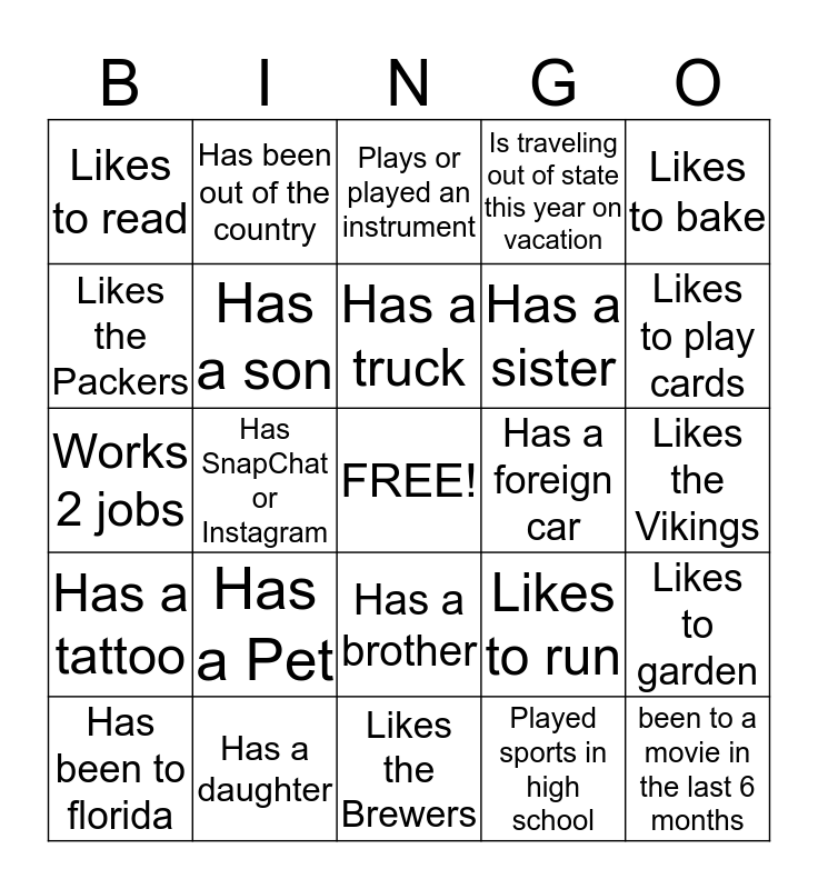 This bingo card has a free space and 24 words: Has a Pet, Has a daughter, Has a truck, Has been to florida, Likes to bake, Likes to read, Likes the Packers, Has been out of the country, Has a foreign car, Has a brother, Has a sister, Works 2 jobs, Likes to run, Likes to garden, Has a son, Played sports in high school, Likes the Vikings, Plays or played an instrument, Likes to play cards, Has SnapChat or Instagram, been to a movie in the last 6 months, Has a tattoo, Is traveling out of state this year on vacation and Likes the Brewers.