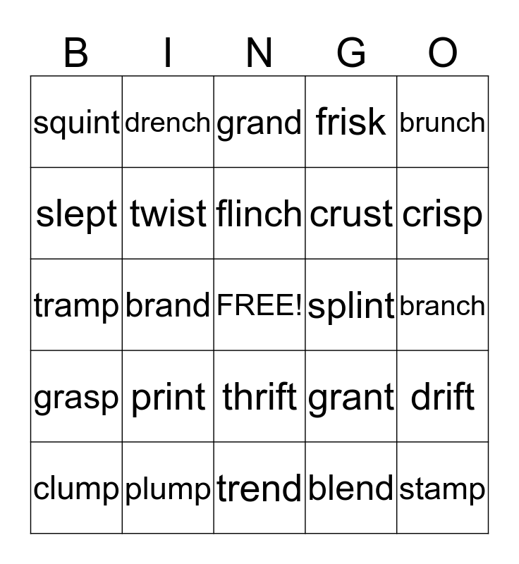 This bingo card has a free space and 30 words: plump, spendt, brand, plant, squint, grand, twist, thrift, splint, trend, branch, stamp, blend, shrimp, crisp, blast, grant, grasp, print, brunch, tramp, slant, drench, crust, slept, frisk, drift, clump, flinch and stand.