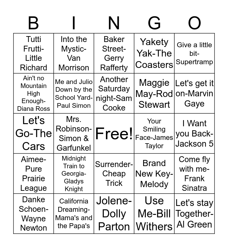 This bingo card has a free space and 30 words: California Dreaming-Mama's and the Papa's, Be my Baby-The Ronettes, Mrs. Robinson-Simon & Garfunkel, You Really Got me-The Kinks, Tutti Frutti-Little Richard, Baker Street-Gerry Rafferty, Me and Julio Down by the School Yard-Paul Simon, Surrender-Cheap Trick, Your Smiling Face-James Taylor, Jolene-Dolly Parton, I Want you Back-Jackson 5, Let's stay Together-Al Green, Use Me-Bill Withers, Me & Bobby McGee-Janis Joplin, Let's get it on-Marvin Gaye, Stuck in the Middle with you-Steelers Wheels, Brand New Key-Melody, Aimee-Pure Prairie League, Midnight Train to Georgia-Gladys Knight, Give a little bit-Supertramp, Let's Go-The Cars, Sister Golden Hair-America, Into the Mystic-Van Morrison, Maggie May-Rod Stewart, Ain't no Mountain High Enough-Diana Ross, Yakety Yak-The Coasters, Come fly with me-Frank Sinatra, Danke Schoen-Wayne Newton, Another Saturday night-Sam Cooke and Bye Bye Love-Everly Brothers.