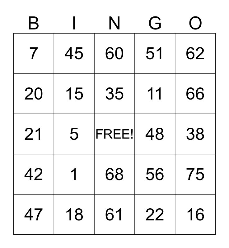 This bingo card has a free space and 24 words: 1, 18, 35, 47, 62, 7, 20, 45, 48, 68, 11, 21, 56, 75, 15, 22, 38, 60, 66, 5, 16, 42, 51 and 61.
