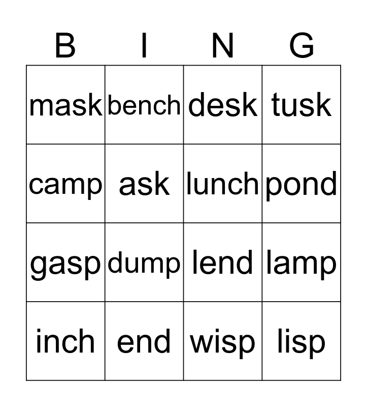This bingo card has 20 words: lamp, band, desk, asp, inch, camp, end, mask, gasp, bench, dump, lend, ask, lisp, lunch, lump, pond, tusk, wisp and munch.
