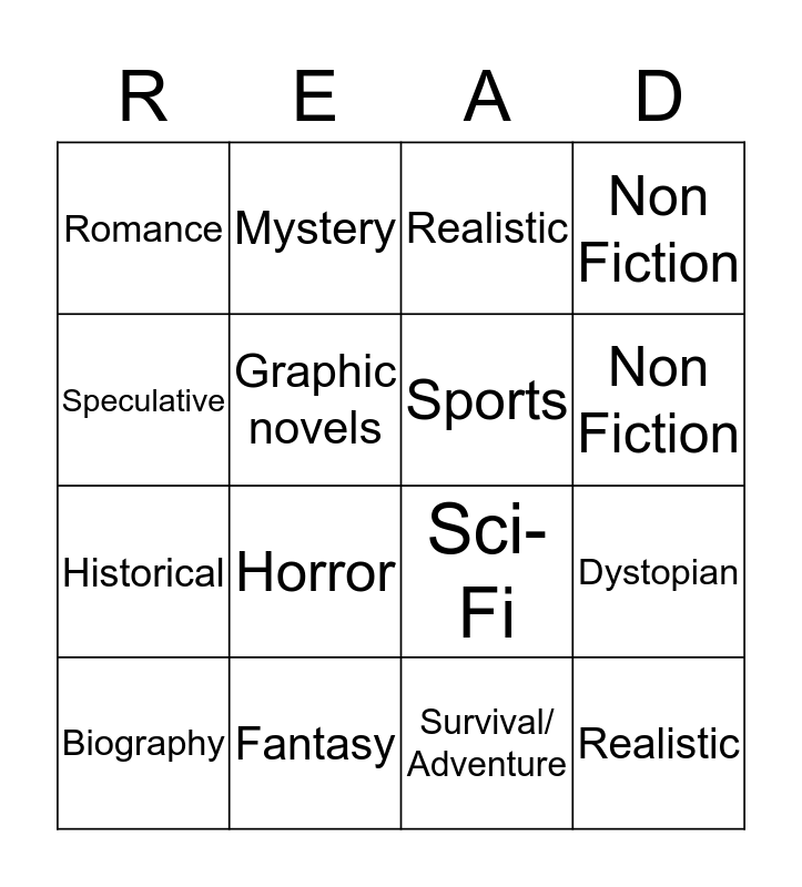 This bingo card has 16 words: Fantasy, Dystopian, Realistic, Romance, Historical, Mystery, Sci-Fi, Survival/ Adventure, Speculative, Graphic novels, Biography, Non Fiction, Horror, Non Fiction, Sports and Realistic.