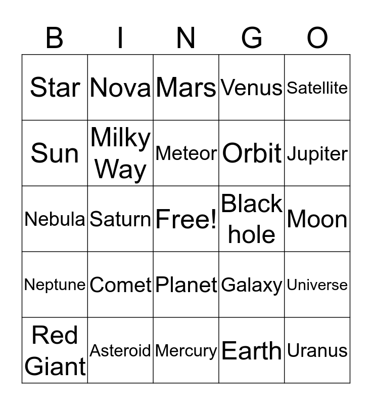This bingo card has a free space and 24 words: Comet, Asteroid, Meteor, Red Giant, Satellite, Star, Sun, Nova, Black hole, Planet, Orbit, Nebula, Galaxy, Universe, Milky Way, Earth, Moon, Mars, Jupiter, Saturn, Uranus, Neptune, Venus and Mercury.