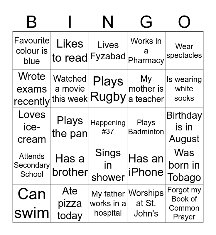 This bingo card has a free space and 24 words: Has a brother, Ate pizza today, Plays Rugby, Can swim, Wear spectacles, Favourite colour is blue, Wrote exams recently, Likes to read, Plays Badminton, Sings in shower, My mother is a teacher, Loves ice-cream, Has an iPhone, Was born in Tobago, Watched a movie this week, Worships at St. John's, Birthday is in August, Lives Fyzabad, Is wearing white socks, Plays the pan, Forgot my Book of Common Prayer, Attends Secondary School, Works in a Pharmacy and My father works in a hospital.