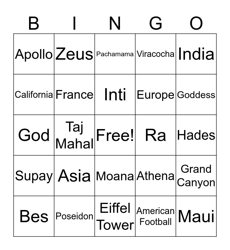 This bingo card has a free space and 24 words: Asia, Poseidon, Inti, Bes, India, Apollo, California, Zeus, Ra, Moana, Europe, God, Athena, Grand Canyon, France, American Football, Hades, Pachamama, Goddess, Taj Mahal, Maui, Supay, Viracocha and Eiffel Tower.