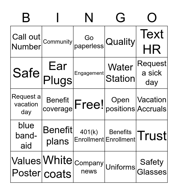 This bingo card has a free space and 29 words: Values Poster, Hairnets, Benefit coverage, Performance evaluation, Call out Number, Go paperless, Ear Plugs, Benefit plans, Open positions, White coats, Vacation Accruals, Safety Glasses, Company news, Uniforms, Request a sick day, Attendance Policy, 401(k) Enrollment, blue band-aid, Text HR, Request a vacation day, Benefits Enrollment, How many points do I have?, Water Station, Safe, Quality, Community, Trust, Engagement and Learn.