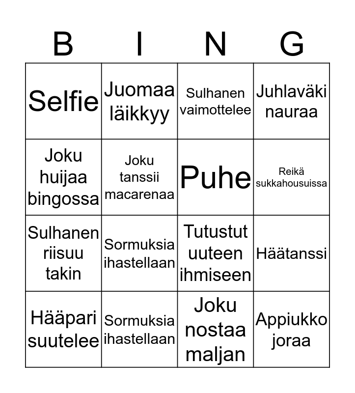 This bingo card has 17 words: Free!, Hääpari suutelee, Juomaa läikkyy, Sulhanen vaimottelee, Häätanssi, Joku huijaa bingossa, Sormuksia ihastellaan, Puhe, Reikä sukkahousuissa, Sulhanen riisuu takin, Sormuksia ihastellaan, Tutustut uuteen ihmiseen, Juhlaväki nauraa, Selfie, Joku tanssii macarenaa, Joku nostaa maljan and Appiukko joraa.